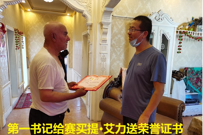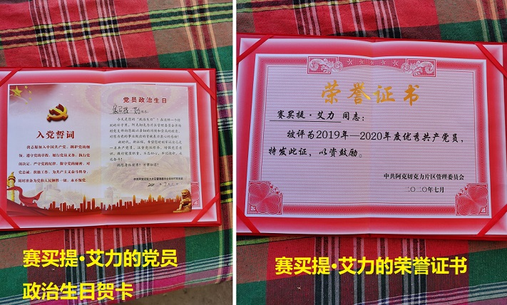 2020年7月1日,他获得了片区党委的高度认可,被片区党委评为2020年度优秀共产党员,颁发了荣誉证书,并颁发了党员政治生日贺卡。由于身体原因,他没有前去领奖,在驻村工作队给他送去荣誉证书的时候,赛买提·艾力激动的眼睛都湿润了。一个劲儿地说着:“感谢党,感谢政府,谢谢!谢谢!”