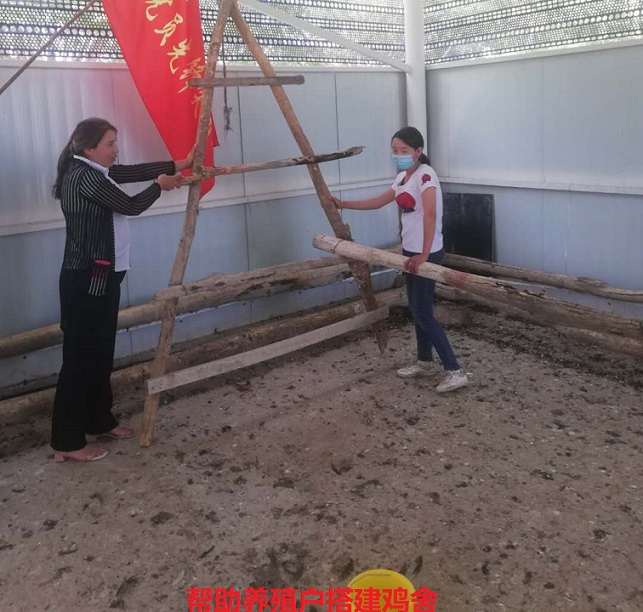 第二组中8名党员先锋队员和12名青年志愿者首先来到2小队油鸡养殖户阿孜古丽·肉孜家中,在对其进行慰问后,立即带领志愿队开展搭建鸡架,打扫鸡舍,顶着酷暑,志愿队发扬了不怕脏、不怕累的精神,帮助3户养殖户搭建了4个鸡架,用自己的微行动践行着共产党员的使命和担当。