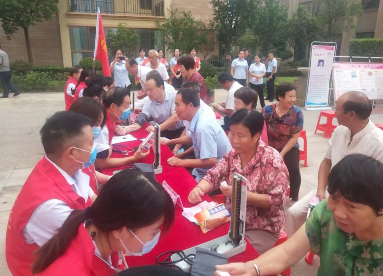 幸福社区文明共创单位固始县国调队的6名党员在纪检组长赵国玲的带领下也闻讯赶到活动现场提供志愿服务。秀水御园小区居民、退休党员、县人民医院原内科主任张泽岺亲自挂帅坐诊。
