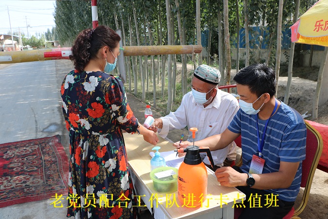 家住大队部旁72岁的老党员吐尔逊·尤努斯每天看着工作队和村干部忙碌的身影,又看了看自己胸前的党徽,他果断联系了其他几位老党员并告诉了他们自己的想法,其他几位老党员也都同意了他的想法。最后他拨通了村第一书记艾斯卡尔·买买提的电话,“艾书记,你们这段时间每天上门测体、温消毒、派送生活用品,每个人都忙得很,我们几个老党员在家也是闲着,请给我们分配任务吧!”艾斯卡尔·买买提听后沉默了,几位老党员主动请缨让他敬佩,但考虑到他们年龄都在七十多岁,又是炎炎夏日,害怕他们身体吃不消,就委婉的拒绝了,但吐尔逊·尤努斯听出了他的担忧,倔强的说“你不要觉得我们身体不好,我们还不老,小伙子们不一定有我们能干呢”。艾斯卡尔·买买提拗不过便答应了他们的请求,让他们协助做好两户居家隔离人员的管控与服务工作。