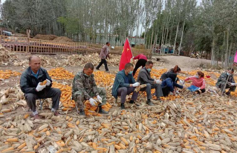 图一:拜城县委后勤办主任刘勃带领党员兴高采烈的前往农户田地中帮助村民收割玉米