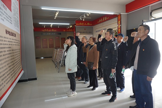 面对红色文化展厅内鲜艳的党旗,老干部们庄重的举起右手,用铿锵有力的声音重温了入党誓词。
