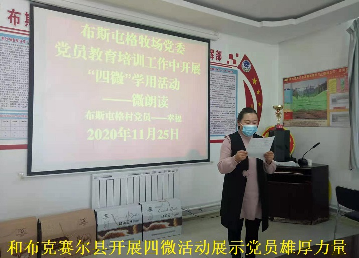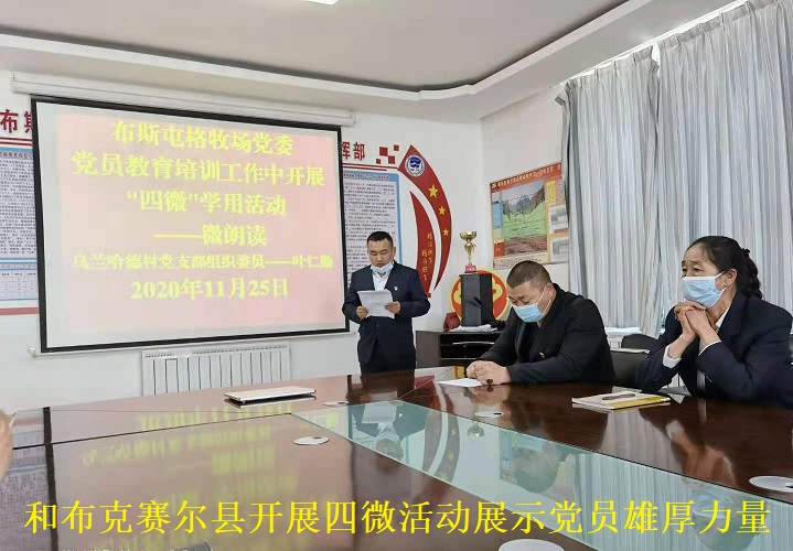 清风网讯(通讯员:多尔吉·巴登 桑格)11月25日,和布克赛尔县布斯屯格牧场按照县委“关于在党员教育培训工作中开展‘四微’学用活动的通知”,召开布斯屯格牧场党委专题培训活动。牧场全体党员学习党的十九届五中全会精神。党委组织委员曹晓奎同志深入浅出、通俗易懂的进行了详细解读,引导党员们由“要我学”变为“我要学”、由“我听讲”变为“我要讲”,增强了党员主体意识,提高了学习质量。布斯屯格牧场布斯屯格村党支部党员代表南慧琴同志讲述身边的微故事,阐述了如何更好在工作中发挥党员先锋模范作用。
