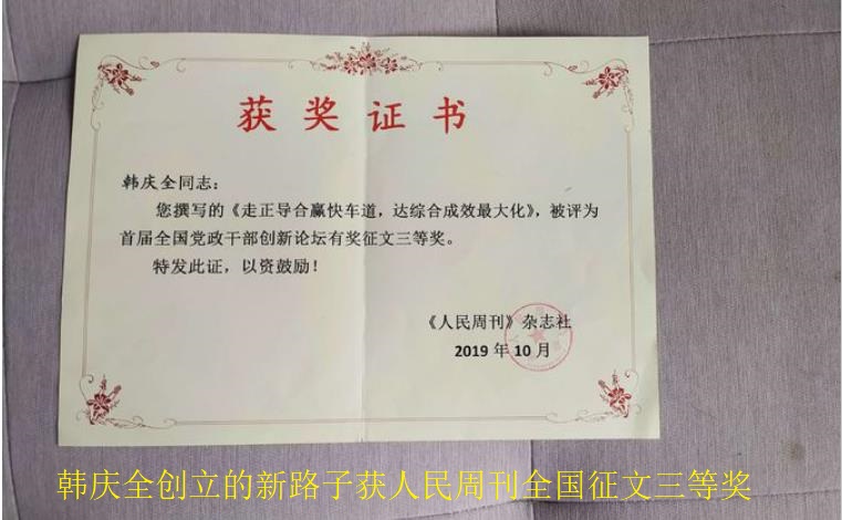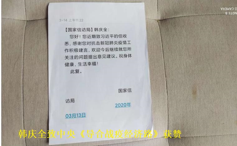 今年以来,韩庆全从实践中创立的《导合战疫经济路》,先在山东省泰安市岱岳区道朗镇下洼村实验成功,山东省委宣传部《诚信山东》等发表报道,获大众点赞,致中央后,2020年3月13日国家信访局复示勉励。