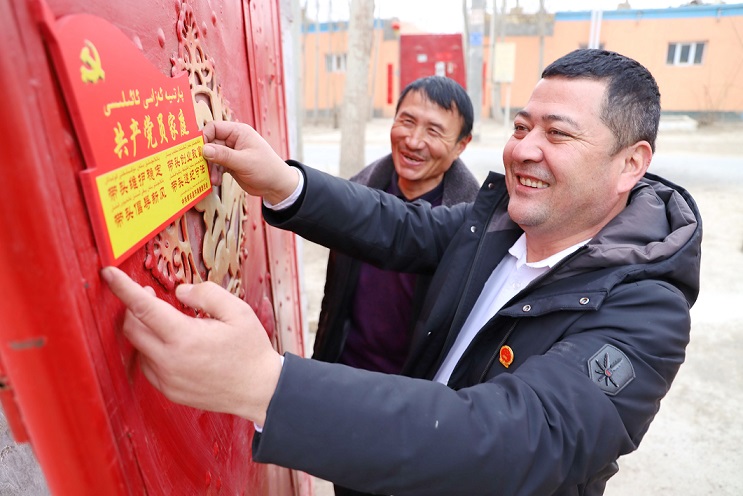 月21日,新疆库车市齐满镇党员干部正在给农民党员艾合麦提·伊敏家挂“共产党员家庭”门牌。今年以来,库车市积极开展“共产党员家庭”挂牌活动,引导广大共产党员亮身份、当表率、树形象。