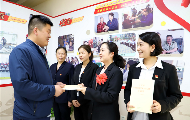 4月22日,新疆库车市东城街道新天地社区党支部书记彭超(左)为正在过政治“生日”的党员干部发放党史书籍。近年来,库车市推行党员干部过“政治生日”制度(即每位党员的入党周年纪念日),通过开展“政治生日”谈话、重温入党誓词等活动,进一步增强了党员的荣誉感。
