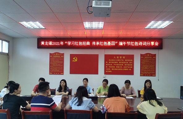 在端午节来临之际,为庆祝中国共产党成立100周年,深入学习贯彻习近平总书记关于“传承红色基因、赓续革命精神”的重要论述,激励广大干部铭记光荣党史,坚定政治信仰。黄龙镇决定在镇机关开展“学习红色经典 传承红色基因”端午节红色诗词分享会。要求镇机关年轻的党员干部全员参与,每人分享一首自己最喜爱的红色经典诗词。所选诗词能够反映中国共产党的百年奋斗历史,讴歌中华儿女进行革命、建设、改革的奋斗历程。以朗读的方式分享红色诗词,抒发爱党、爱国的深切情怀以及对红色革命的追忆。