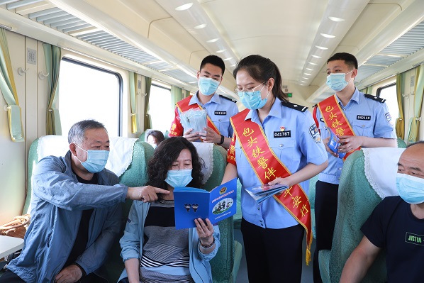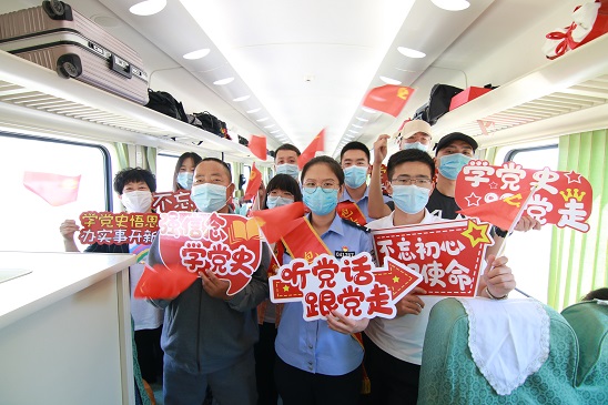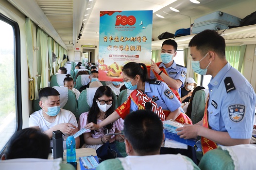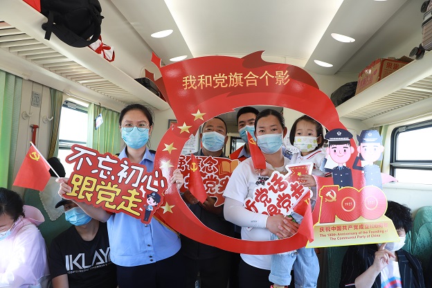 在飞驰的列车上,铁路民警通过“列车微党课”、“百年党史知识问答”、“同唱一首歌”、“我和党旗合个影”等宣讲方式,与旅客群众一起互动互学,共同感悟党的百年奋斗历史。