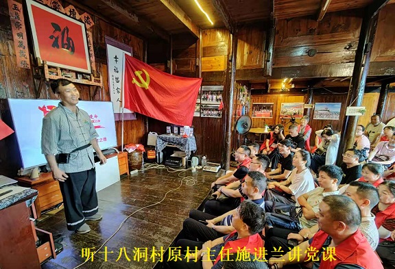 来到十八洞村,党员们首先观看了记录片《十八洞村脱贫记》,聆听了十八洞村原村主任施进兰讲的党课《蝶变十八洞,精准扶贫之路》。接下来,在讲解员的引导下,党员们沿着习近平总书记当年考察时走过的路线进行参观。讲解员详细介绍了习近平总书记当年亲切慰问老百姓、召开座谈会了解民意的情形。过去的十八洞村山高路远、闭塞落后,现在的十八洞村道路畅通、村落整洁,设置有金融扶贫服务站、村级银行便民服务点、税务便民服务点、电商服务站,还有“幸福人家”“巧媳妇”等农家乐,村容村貌大变样,村民收入大提高。大家真实感受到了精准扶贫给十八洞村带来的翻天覆地的变化。当讲解员带领党员们走进“精准扶贫之路”主题展示厅,一张张照片,一段段文字,重现了十八洞村脱贫致富历程。