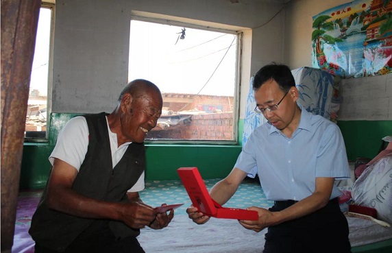 苗耀光先后来到固阳县东廉租房退伍军人贾英及下湿壕镇老党员温满书家中为他们送去节日的祝福。“您老还记得是哪一年入党吗?现在身体状况怎么样?……”每到一处,苗耀光都亲切的握住老人的手,和老人促膝交谈,详细询问他们的日常生活、身体健康等情况,对他们为党的事业作出的贡献表示感谢并送上慰问金。