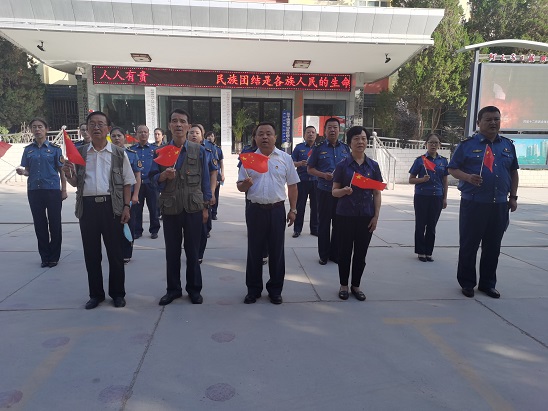 上午9时30分,阿克苏执法支队全体党员干部及离退休党员代表统一着装,精神饱满,齐聚在国旗台前,随着“升国旗、奏国歌”的嘹亮口令,全体人员庄严注视着鲜艳的五星红旗冉冉升起、高高飘扬。