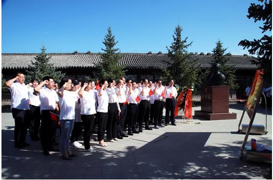 “我志愿加入中国共产党,拥护党的纲领,遵守党的章程……”在乌兰夫故居前,全体党员高举右拳,在鲜红的党旗面前重温入党誓词,铿锵豪迈的誓词响彻云宵。