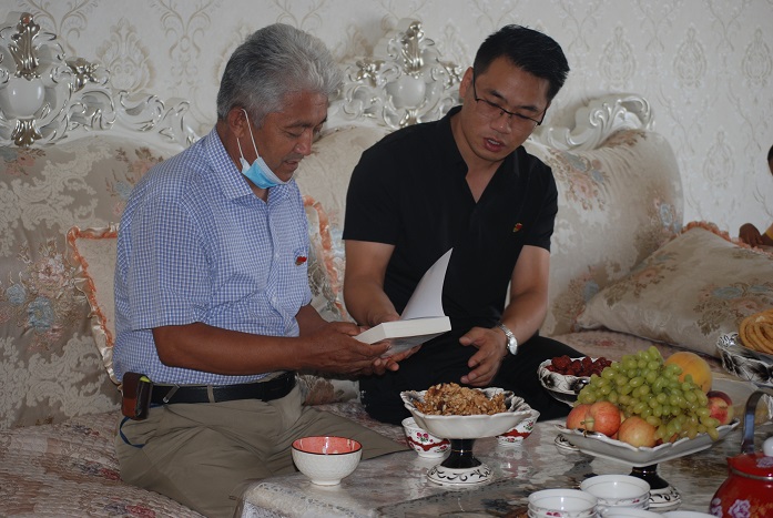 8月31日,阿克苏市新城街道百合园社区党支部开展“党史学习”主题教育“送学上门”活动,新城街道百合园社区包联领导叶辉和社区工作人员走访辖区内老党员,把《论中国共产党历史》等党史学习书籍送到少数民族老党员阿不都热扎克•阿布都拉家中。