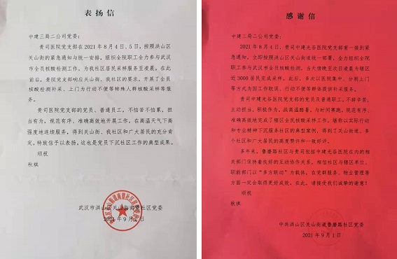 鲁磨路社区党委在感谢信中写道“贵司医院党支部的党员及普通员工,不辞辛苦,主动担当,积极作为,战高温酷暑,与时间赛跑,规范有序、准确高效地完成了社区全民核酸采样工作,堪称以实际行动和专业精神下沉服务社区的典型案例,得到了关山街道、多个社区和广大居民的高度赞许和一致好评。”