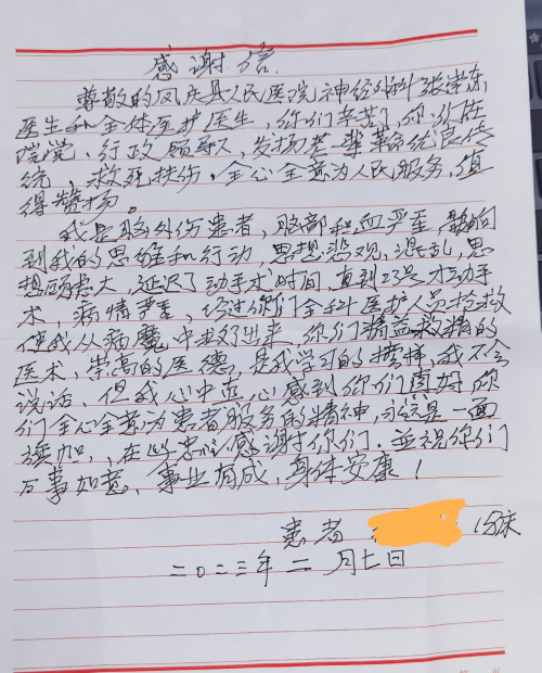 据了解,这是一位“颅内血肿”患者,患者前后两次到院就诊,接诊医生均为张崇东主任,患者首诊时诊断为“颅内血肿”,需要进行手术治疗,张主任与患者和家属几番耐心沟通后,家属表示理解同意手术治疗,但患者听到手术要“开颅”立马表示无法接受,不顾劝阻离开医院,张主任只能与家属互留电话,告知如果患者病情有突发情况立即联系他。患者走后张主任始终惦记着患者病情,每天与该患者家属了解患者情况。6天后,张主任接到家属电话,因患者症状突然加重,出现间断性意识障碍,在家发生跌倒,张主任随即告知家属患者这种情况需要行急诊手术,交代途中注意事项后,立即联系麻醉科在患者到院前做好急诊手术前准备,患者进入手术室后,两个科室团队密切配合,最终顺利完成“急诊颅内血肿清除术”,患者转危为安。术后1周,患者神经精神症状恢复良好,头晕、头疼消除,切口恢复良好,可下床自由活动,生活自理。出院当天,患者手写了一封感谢信送到张主任手中,以表达对神经外科医护人员的感谢。(凤庆县人民医院:张崇东、陈小俊)
