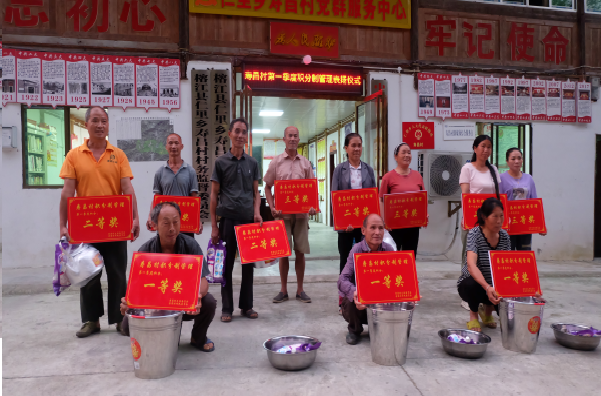 实施“措施”,促成“积分制”见效。通过爱心帮扶、红利待遇、评先评优、绩效报酬挂钩四项措施,推动积分成果转化。每季度经村两委组织村民代表实地考核和结合农户平常表现,评出各类先进前三名不等,组织召开全体村民大会进行表彰并根据积分高低兑换生活用品,调动群众参与村级事务的积极性;村集体经济的分红,可按照所得分值占比,年终向各户发放红利,积分越高,获得的红利越多;并将积分作为评定“最美庭院家庭”、“致富带头家庭”、“最美公益岗”、“最美家庭”等荣誉的重要依据,激发群众树榜样,榜样当标杆,弘扬正能量。