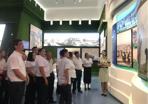 在讲解员的引领下,大家有序走进柯柯牙纪念馆,展馆内一幅幅真实历史图片、视频影像、阿克苏原始地貌实物,深刻反映了阿克苏地区老一辈生活的艰辛困苦。通过融合声光电等现代科技,图文并茂、光影再现、虚拟仿真、沙盘模型等方式,再现了阿克苏党员干部带领各族群众在盐碱沙滩“一年接着一年干、一代接着一代干”持续30余载实现了“人进沙退”的团结奋斗史。从昔日“漫卷狂风蚀春色,迷蒙黄沙掩碧空”的荒原大漠到今天“风拂杨柳千顷绿,水润桃杏万园红”的苍茫林海的变化,这是阿克苏地区党员干部群众在这片贫瘠的土地上,践行““绿水青山就是金山银山”理念,创造了昔日戈壁荒滩、黄沙遮日如今绿树葱茏、天净水清的人间奇迹。