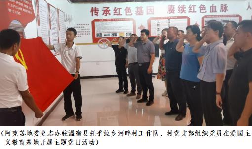 阿克苏地委史志办驻温宿县托乎拉乡河畔村工作队充分发挥单位业务优势,结合实施文化润疆工程,深入挖掘红色资源和爱国主义教育资源,积极打造以河畔村方志馆、村史馆、红色文化传承室、“理清两笔账 感恩共产党”“明白墙”为主的红色教育基地和爱国主义教育基地,通过定期组织党员参观学习、开展“主题党日”等形式,使党员接受红色文化熏陶,体会红色精神内涵,赓续红色血脉,传承红色基因,坚定理想信念,厚植爱国情怀,以实际行动铸牢中华民族共同体意识。