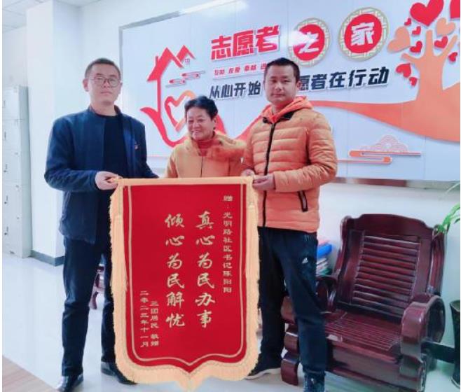 2023年11月20日的清晨,社区居民袁荣华女士带着满心的感激之情,早早地来到了光明路社区。她手中紧握着一面鲜艳的锦旗,脸上洋溢着喜悦的笑容。当她见到社区党支部书记陈阳阳时,激动的心情让她流出了泪水,她的话语都变得有些颤抖。