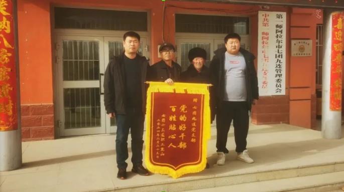 2月29日上午,七团玛滩镇九连居民熊山携父亲熊成明一起将一面印有“党的好干部,百姓贴心人”的锦旗专程送到九连党支部,为其找到走失的父亲表示诚挚谢意。