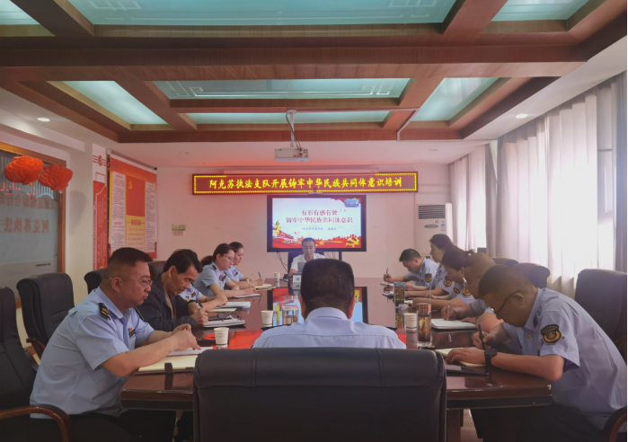 为深入学习贯彻习近平总书记关于加强和改进民族工作的重要思想,全面贯彻党的民族政策,引导全体党员干部铸牢中华民族共同体意识。做好“第42个民族团结进步教育月”工作,5月15日上午,阿克苏执法支队邀请阿克苏市委党校老师以“有形有感有效 铸牢中华民族共同体意识”为题,讲授了一堂内涵深刻、生动翔实的专题党课。支队全体党员干部60余人参加学习。