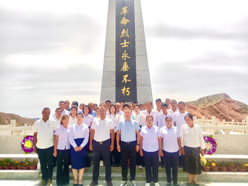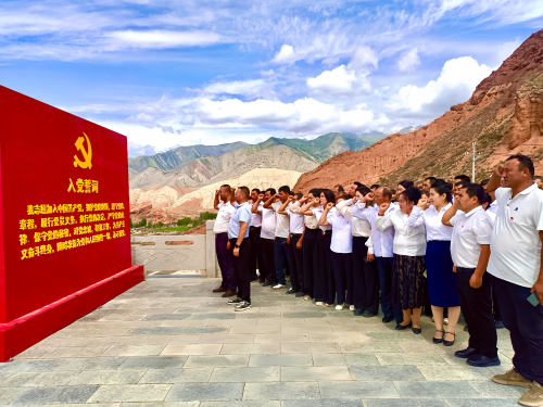 在纪念碑,全体党员干部庄严肃立,伴着雄壮的《义勇军进行曲》,高唱国歌,深切表达对祖国和党的热爱。之后举行了庄严的授党旗仪式,面对鲜红的党旗,大家郑重举起右拳,驻村工作队队长、第一书记阿力木江·阿布拉带领全体党员高声宣读入党誓词。党员同志们重忆入党经历,重温当年的决心和信念,再一次接受了心灵的洗礼,受到了党性的锤炼,再一次深刻体会到了作为一名共产党员的初心和使命。