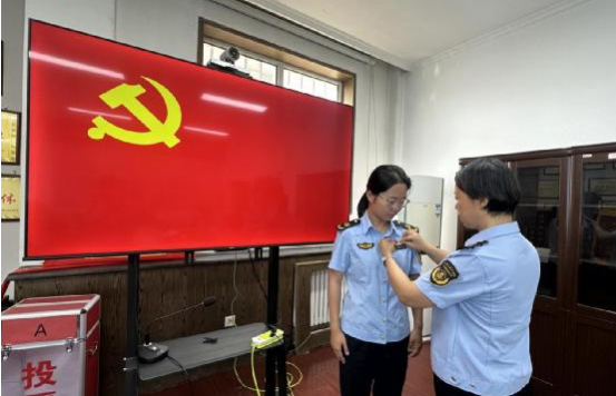 伴随庄严的《国际歌》,党支部优秀党员代表为预备党员佩戴党员徽章,赠送《党章》,传递奋斗精神,传承初心使命。党支部书记带领预备党员面对党旗,举起右拳,以昂扬的姿态和饱满的热情,铿锵有力地重温入党誓词,党员胸前佩戴的徽章格外熠熠生辉。