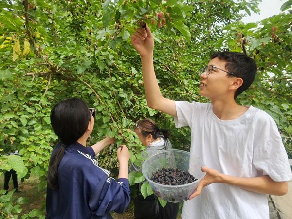 6月8日,新疆阿克苏市依干其镇尤喀克乔格勒村的田园里,成熟的桑葚挂满枝头,游客在体验采摘的乐趣。