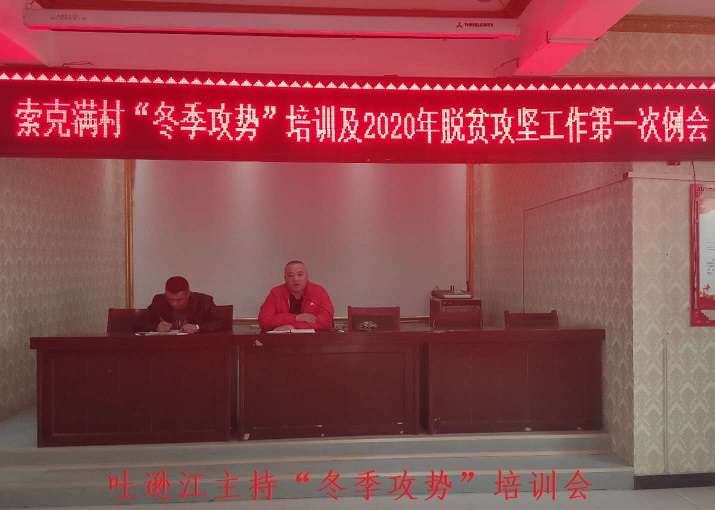 清风网讯(作者:新疆农业大学:阿拉法特·克依木//摄影:新疆农业大学:帕尔哈提·玉山江)为扎实贯彻落实习近平总书记关于精准扶贫、精准脱贫基本方略,集中力量开展脱贫攻坚“冬季攻势”,进一步加大脱贫攻坚培训工作力度。1月9日,新疆农业大学驻阿瓦提县拜什艾日克镇索克满村“访惠聚”工作队召开2020年度“冬季攻势”培训暨脱贫攻坚工作第一次例会。培训会由新疆农业大学学生工作处党总支书记、工作队队长、第一书记吐逊江主持,全体工作队队员、村“两委”、党员、贫困户参会。