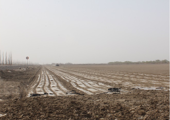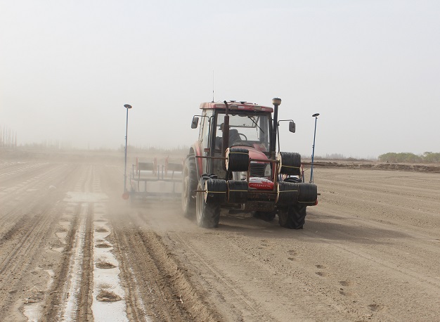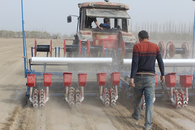 种植户王国让介绍道:“今年农用水资源比较紧张,经过考虑后决定不采用传统的种植模式,试行“干播湿出,然后一膜三带”。“干播湿出”技术全称为“膜下滴水蓄墒排盐”种植技术,是对上一年收获的棉田不再春冬灌,直接进车犁地、耙地、铺膜,然后花上一两天的时间,安装地面管,接滴灌带,滴灌带滴水引墒,待到温度湿度适宜时滴水。既节约了棉田春冬灌用水,又达到了棉花苗齐、苗壮、苗匀的生长目标,为棉花高产、稳产夯实基础。先铺膜,能有效减少土壤水分蒸发、增温保墒抑制盐碱,有助于种子萌发,达到一播全苗的效果,进而提高棉花单产。
