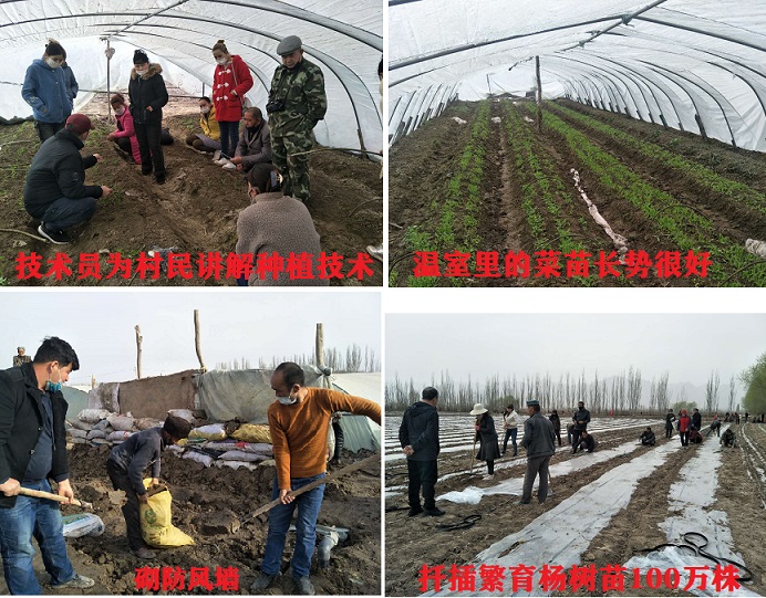 南疆地区春季多风,气象信息提示,近期有大风沙尘。为了保护好大棚里的菜苗,工作队带领村民提前做好防风准备。在贫困户亚生·阿布拉和莫明·那买提家的大棚前,工作队队员们不怕脏不怕累,拿着铁锹和村民们一起装沙袋,垒防风墙,干的正带劲。亚生·阿布拉说:“很感谢工作队长期以来对我的帮助,如今我脱了贫,今年我有信心赚更多的钱,把日子过得更好”。