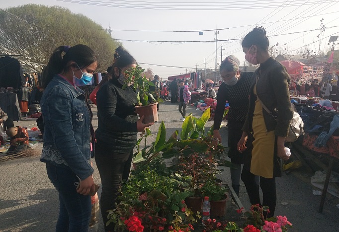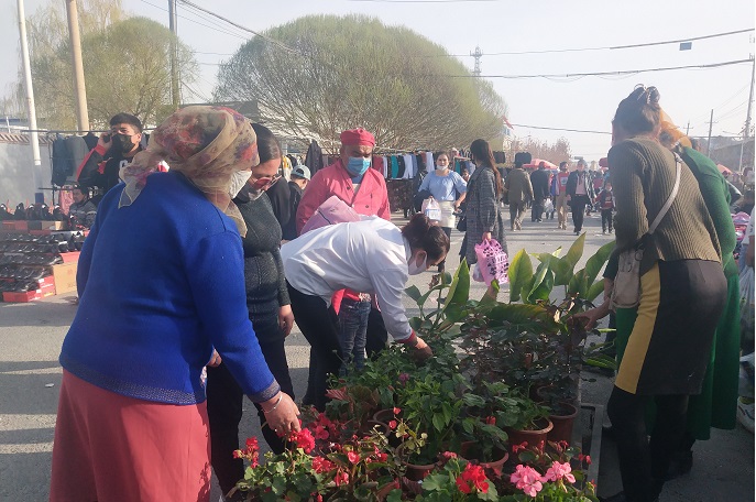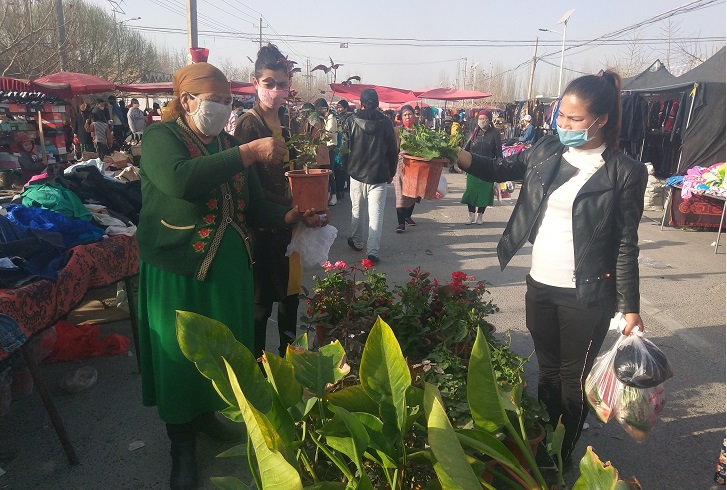 清风网讯 (通讯员:图/包良廷 、 文/郎宏菊) 4月10日,阿瓦提县塔木托格拉克镇托万克塔木托格拉克村贫困户米月古丽·阿合尼亚孜正在该镇集市上出售自己家种植的鲜花苗木,前来问价、购买的人陆陆续续,米月古丽·阿合尼亚孜一直不停的吆喝着,忙着不停。