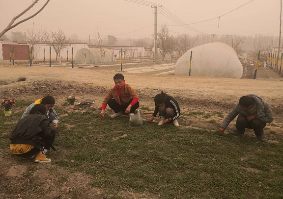 上午12点,工作队,村干部,农民群众们来到村民阿依米古丽·阿布都合力力的后院,大家一起开始忙碌起来,划分区块摘苜蓿,一起摘刚长出来的苜蓿,边摘边聊天,欢声笑语,大家都很轻松。