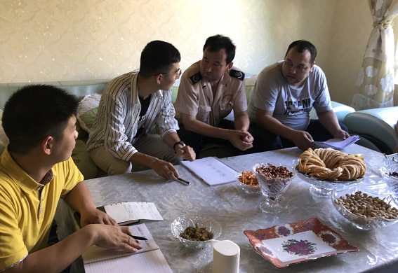 2020年5月22日,协里克买里社区访惠聚工作队员邓崇斌同社区干部艾买尔·阿布拉等人一起走访辖区居民,根据每户的基本情况针对性地向他们宣传九项惠民政策,让居民真真切切的感受到党和政府对新疆各族儿女的亲切关怀,并引导居民热爱伟大祖国,热爱中国共产党,学会感党恩听党话跟党走。