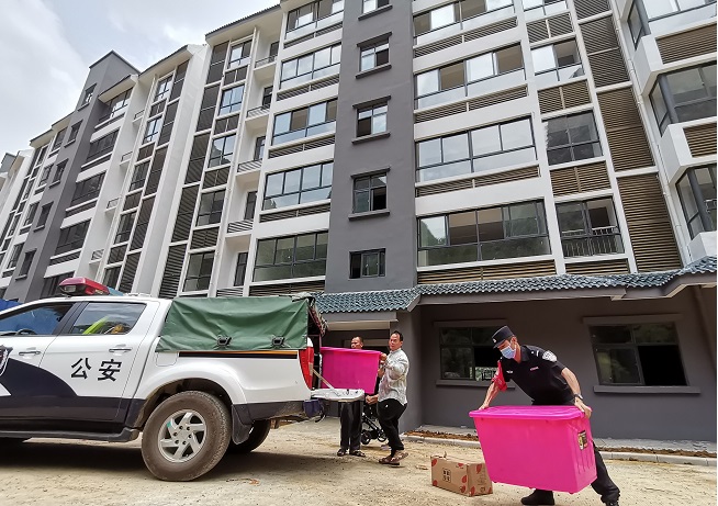 当天,广西崇左边境管理支队硕龙边境派出所民警们来到从义宁村板内屯,与群众一起整理行李、搬运家具、打扫卫生、安装家电,7户贫困群众全部兴高采烈的搬入江海安置小区新房,结束了小木屋的居住生涯。