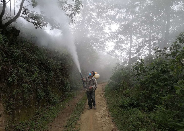 森林病虫害是“不冒烟的森林火灾”,大寺乡高度重视,迅速行动,组织护林员在回龙村和岔河村进行人工喷洒生物农药,灭杀桤木叶甲。工作人员不惧炎热,背着沉重的防治器具,穿梭在茂密的林区,喷洒的药物形成滚滚浓烟弥漫在整个林区,防治面积共达2000多亩。同时,要求各村护林员要充分利用巡山时机,认真检查病虫害情况,转变被动局面,做到早预警、早报告、早防治。