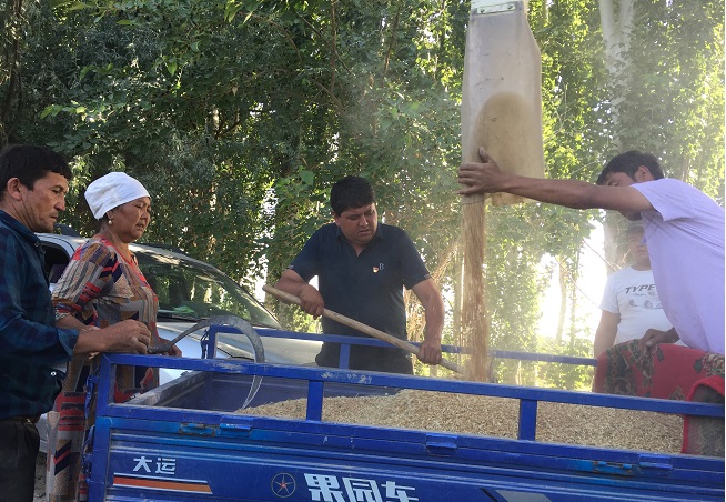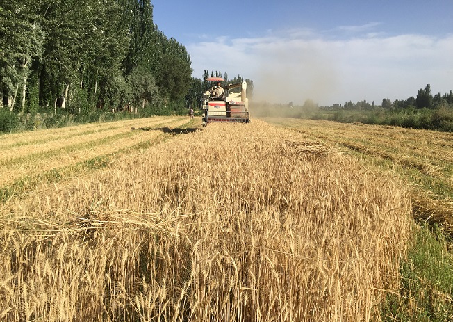 在村民依明·阿木提的麦子地里,收割机正在不间断往来运作,不一会儿的功夫就将数亩地收割完毕。色泽光亮、颗粒饱满的麦粒在轰隆隆的声音中跳跃着流淌到车厢里。依明·阿木提高兴地说“我今年种了10亩麦子,在村干部的督促指导下,精心管理,及时浇水施肥,今天收割的麦子颗粒饱满,预计会比去年增产200公斤左右。”