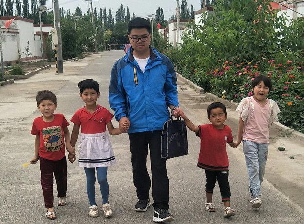 图二:孙涛牵着帕提曼·司马义、阿依左克拉·司马义等一群孩子行走在回家的路上