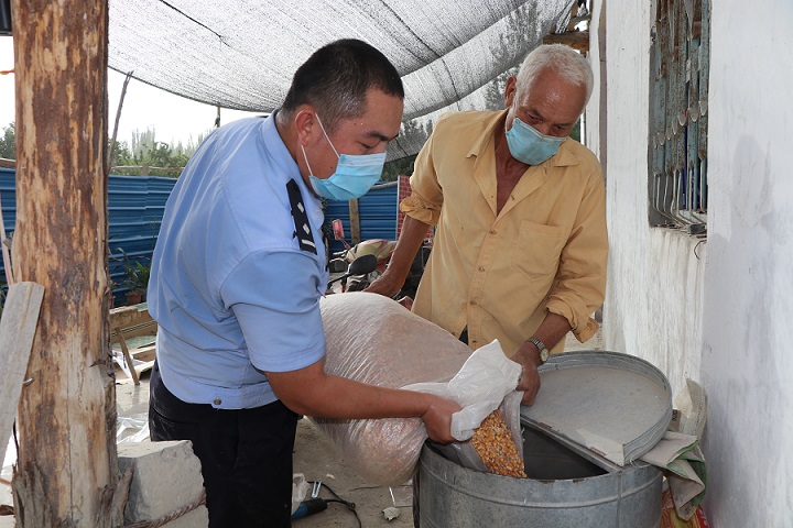正在村里开展帮扶的阿瓦提县公安局民警齐海涛听到困难群众依明·马木提和邻居的对话,看到了困难群众断掉“穷”根,由穷到富的希望,他从心里开心地笑了。
