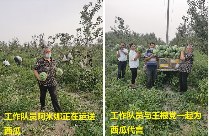 王根党家25亩苹果地,年初在驻村工作队的引导下,铺塑膜套种了西瓜,由于后期管理得当,现在西瓜成熟收获,但由于丰产,再加上家里劳动力少,地里的西瓜采摘进度比较慢。这可让王根党急的冒了火。工作队员阿米娜在入户走访了解到这个情况后,立即向工作队反映了这个情况,工作队当即决定去帮助他收获、装车。