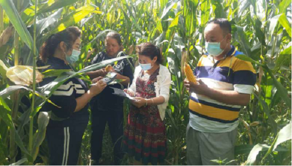 下图为乡农技站技术人员在玉米田进行测产中:(米吉克乡人民政府:阿娜尔古丽·达吾提)