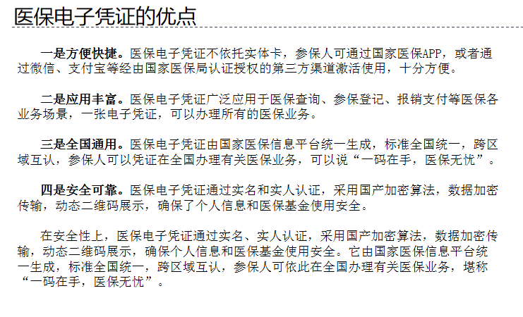 据了解,医保电子凭证是由国家医保信息平台统一签发,是基于医保基础信息库为全体参保人员生成的医保身份识别电子介质,是全国医保线上业务唯一身份凭证。医保电子凭证通过实名/实人认证技术,采用加密算法形成电子标识,认证唯一,安全可靠,方便快捷,应用丰富,全国通用。