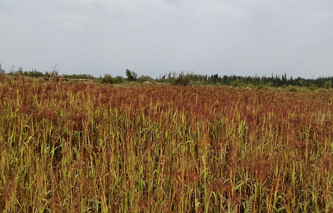 清风网讯(阿克苏地区自然资源局;卢子祥)2020年为坚决打赢脱贫攻坚战增加贫困户收入,新和县新和县尤鲁都斯巴格镇奥依其兰村10户贫困种植50亩高粱,进入秋收季节,一片片红高粱映入眼帘,一串串籽粒饱满的高粱穗压弯了枝头,微风吹过,铺开了一层层深红色的高粱穗浪,丰收喜悦画面映红了田间头,贫困户心里乐滋滋的。