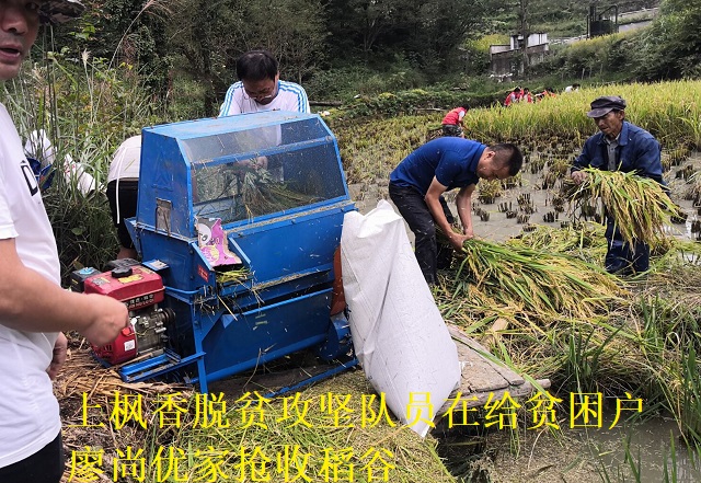“感谢这些干部,免得我们老两口可能要忙到9月间都收不完谷子!”上枫香四组的廖尚优指着家里一大堆刚刚收割回来的稻谷,高兴地对邻居们说:“这些干部别看平时都斯斯文文的,但他们到田里干活时,一点都不比我们农民差。”正因为有这支热心的脱贫攻坚工作组,使上枫香村一些熟透了的稻谷,因受雨水浸泡将面临减产减收而成为“杨白劳”的农户,在临时晴好的天气里,得到驻村干部的热心帮助下,使黄橙橙的稻谷及时得到收割归家。采访中,上枫香村下枫香八组贫困户廖朝熙告诉笔者,9月10日这天,攻坚队员抽出4名干部到他家一块3亩多的稻田里劳累了一天,两台收谷机共收割了1000多公斤。尽管老天尚未放晴,但谷子收到家里后,全家人心里踏实得多了。