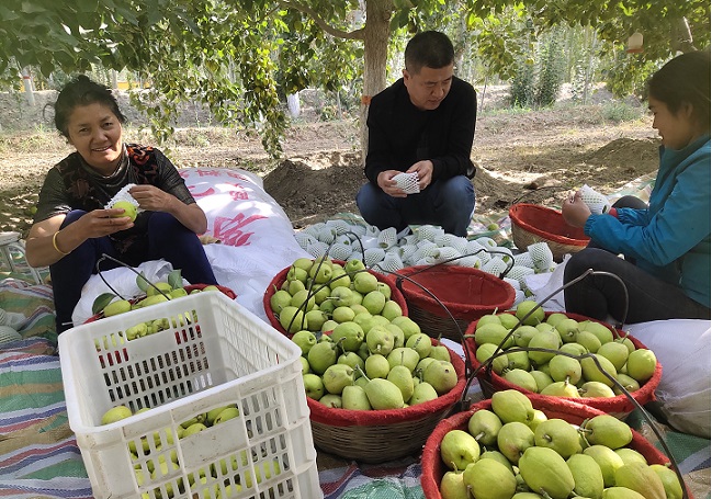 近日来,古勒巴格镇阿牙克库勒达西村“访惠聚”工作队积极帮助梨农采摘香梨,与梨农们一起在充满甜蜜味道的梨园里共享丰收的喜悦。