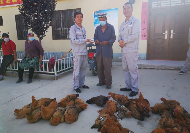 在吉勒尕博依村大队部,贫困边缘户乃麦提·艾麦提早早的就接到工作队的通知,把自家养的鸡拿到了大队部,等待侯风平他们来收购。当侯风平把买鸡的钱递到乃麦提·艾麦提手上时,他脸上洋溢着灿烂的笑容,激动的说:“以往家里养的鸡不是自家人吃掉就是很便宜的卖到巴扎上了,没有想到今天公司统一来收购,价格也挺高,还现场就给钱,以后我要多养鸡,多赚钱!”