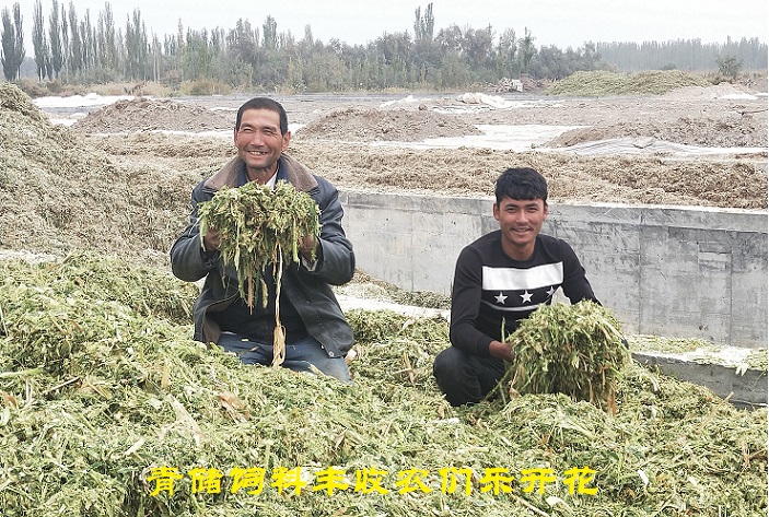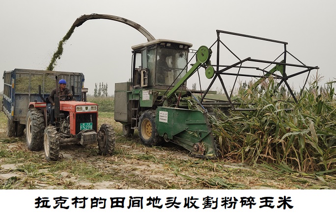 青贮玉米是本地小麦收割后,种植的专门用来饲喂牛羊等牲畜的二茬玉米。收割时,包括玉米棒穗在内的整个玉米植株,都一次性完成收割、粉碎、装车,再经过青贮发酵后,成为牲畜过冬的青贮饲料。玉米秸秆和籽粒同时青贮具有营养价值高、动物口感好,饲料转化率高的优点。复种玉米青储,不仅提高了土地的利用率,也解决了农民养殖牛羊冬季饲料不足的后顾之忧。