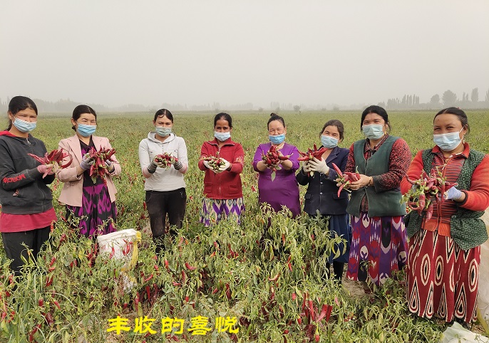 经过五个月的技术人员精心呵护下辣椒也成熟了,2020年10月2日,吐格曼贝希村工作队和“村两委”班子成员组织村民收辣椒。因辣椒种植规模较大,全村村民抓住捡棉花还未开始的时间互帮互助,保证尽快收完。看到红火火的辣椒,村民脸上都露出了得意微笑。