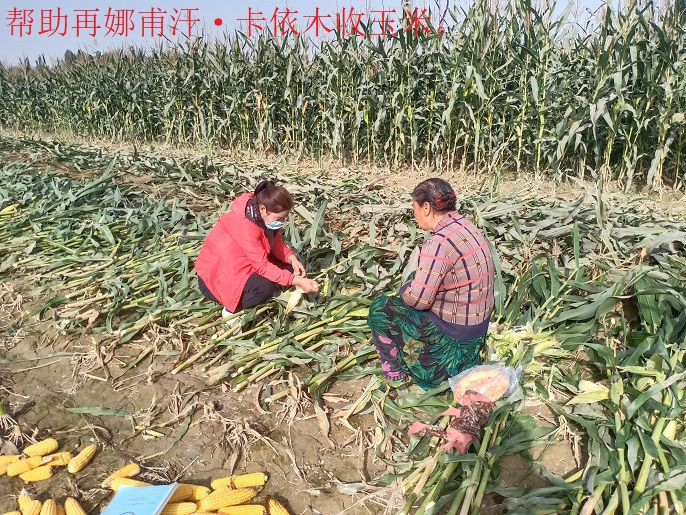 在英艾日克镇玉斯屯克帕万拉村的玉米地里,晾晒玉米的院落里,村干部和工作队的同志正在帮村民收玉米,你一个、我一个把玉米从秸秆上掰了下来,运到院子里,归整后变成了玉米墙,这是村“两委”和“访惠聚”干部与劳动人民的“与民情”。