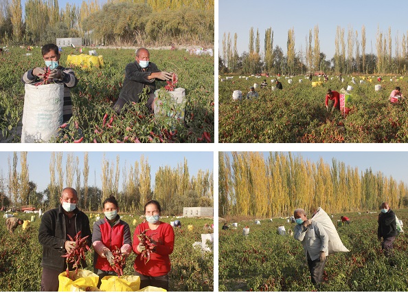 10月20日,在阿瓦提县塔木托格拉克镇玉斯屯克阿热勒村,辣椒种植户正在采摘辣椒。近年来,该镇不断优化种植业结构,推进订单农业发展,帮助农民增收致富,目前3000亩色素辣椒喜获丰收。